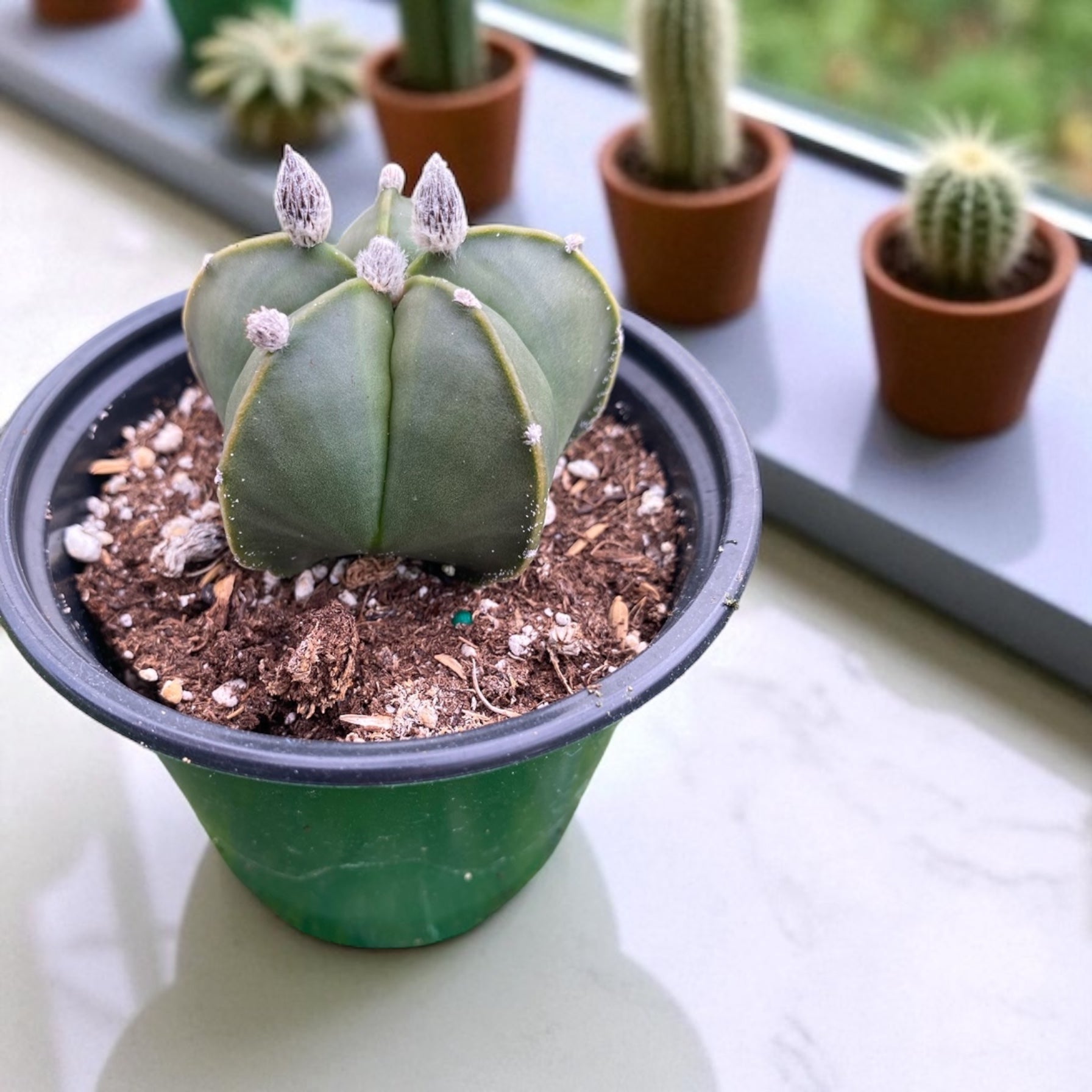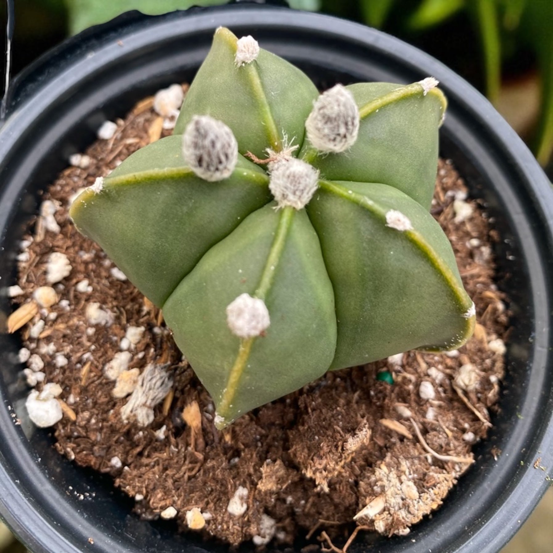 Bishop's Cap cactus, Bishop's Hat, Bishop's Miter, or Star Cactus, a species native to the highlands of northeastern and central Mexico. a star-like shape when viewed from above, resembling a bishop's miter.