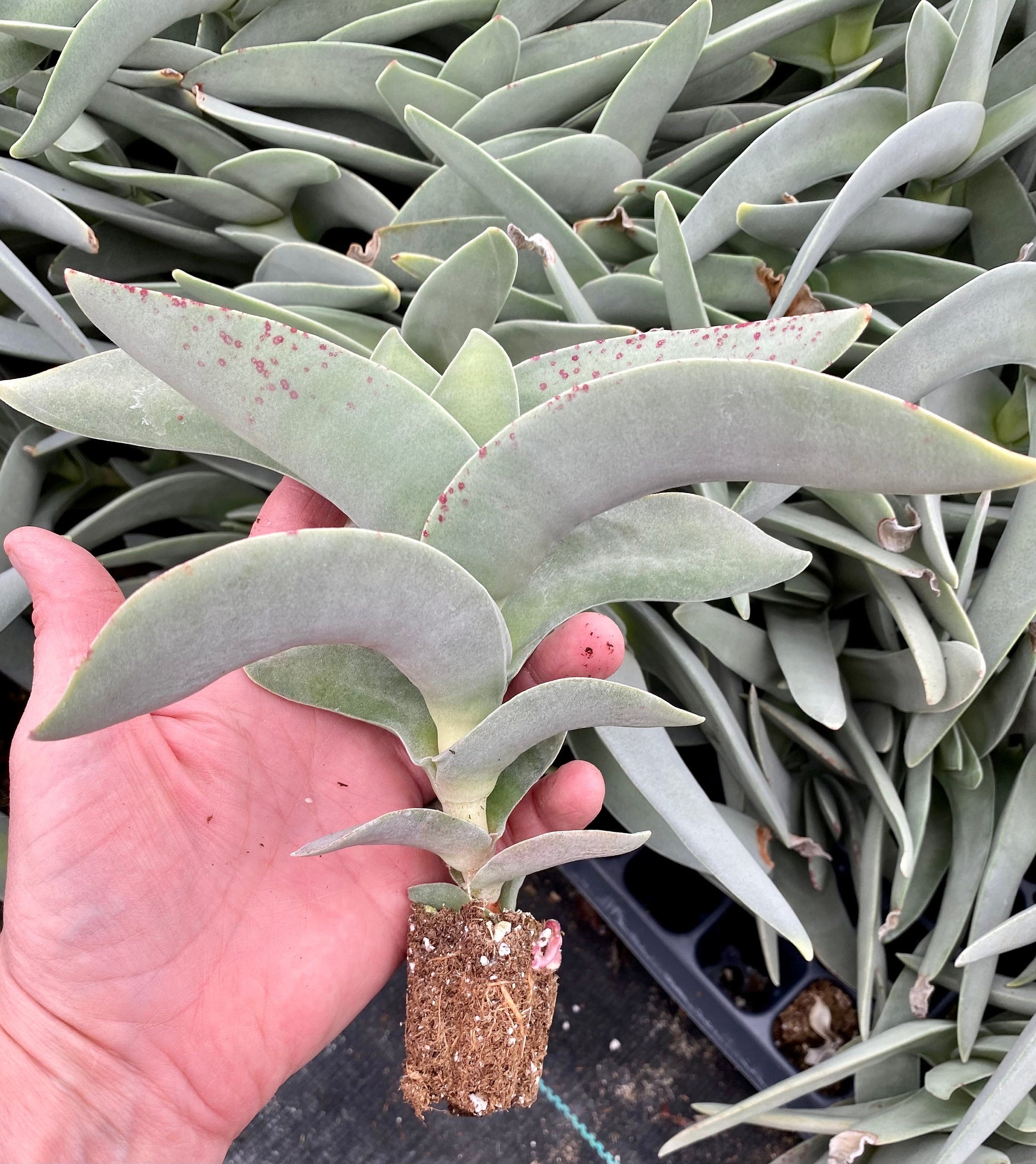 The rare Propeller plant produces beautiful Red flowers that last for weeks! this unusual looking plant has thick gray- green leaves that look like airplane propellers ! They are native to South Africa