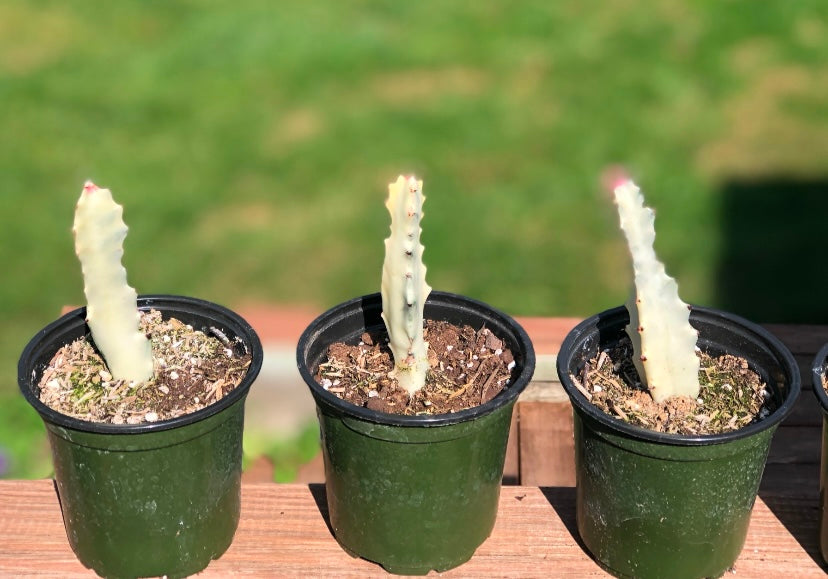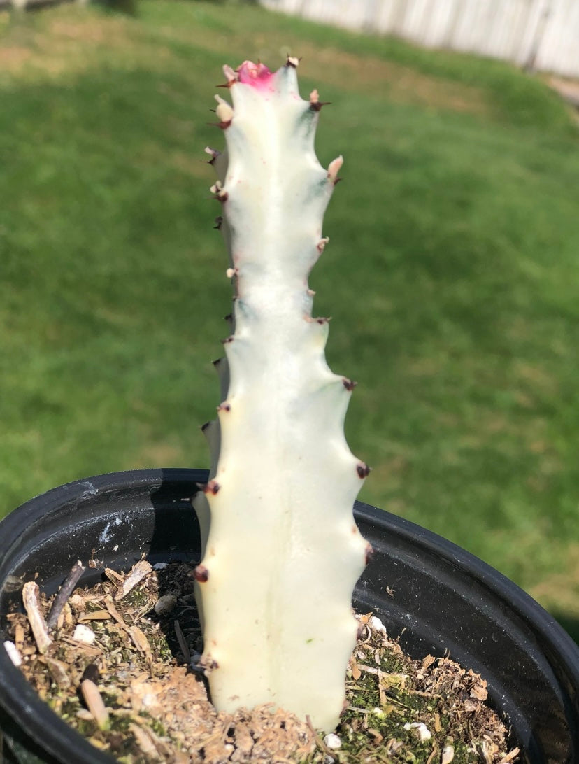 THIS RARE- WHITE CACTUS IS ACTUALLY A SUCCULENT ! Native to India , it can grow to 10 ft tall ! This striking , unique plant is white due to its lack of Chlorphyll tissues necessary to produce green stems! Needs full sun is variegated, and has tiny green heart shaped leaves and PINK TIPS/SPINES !