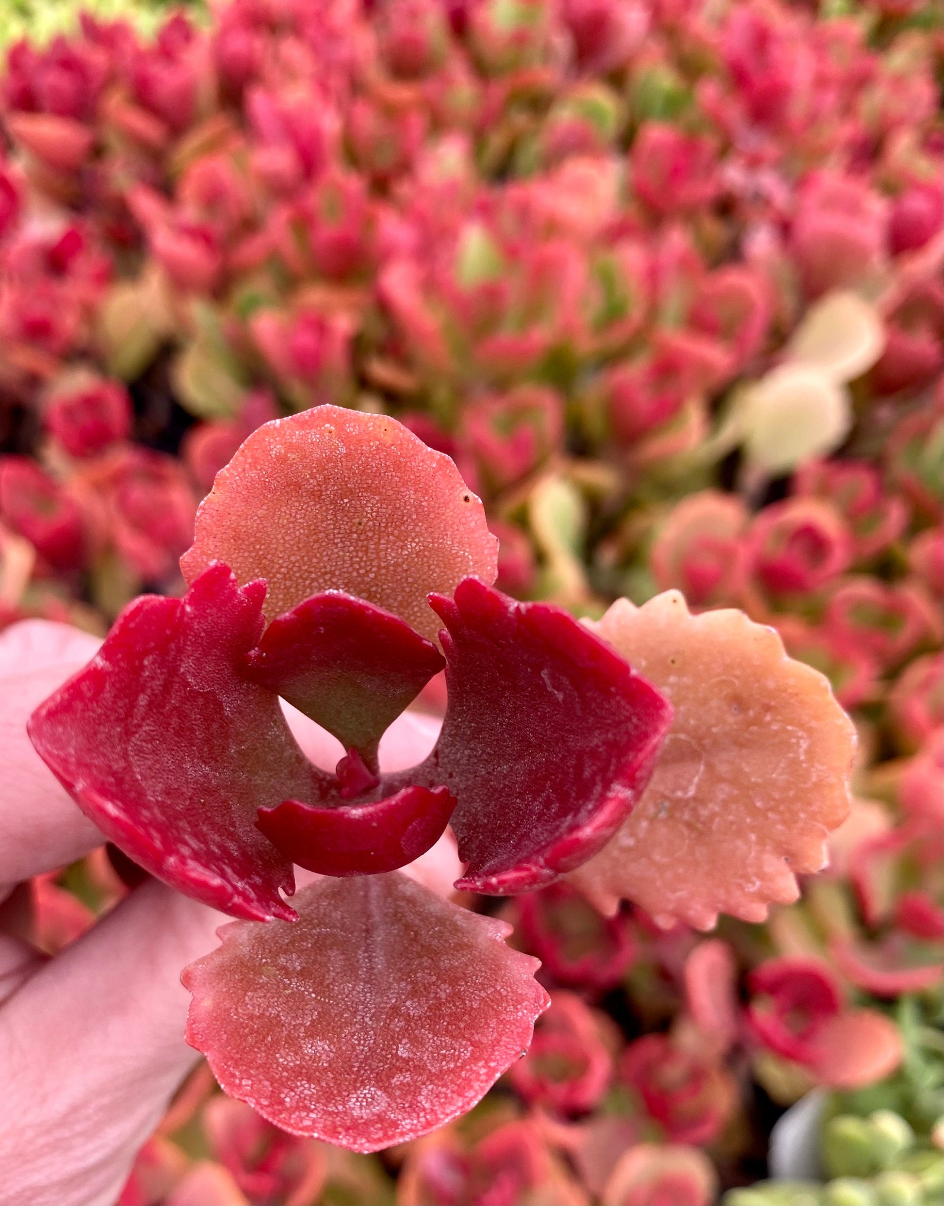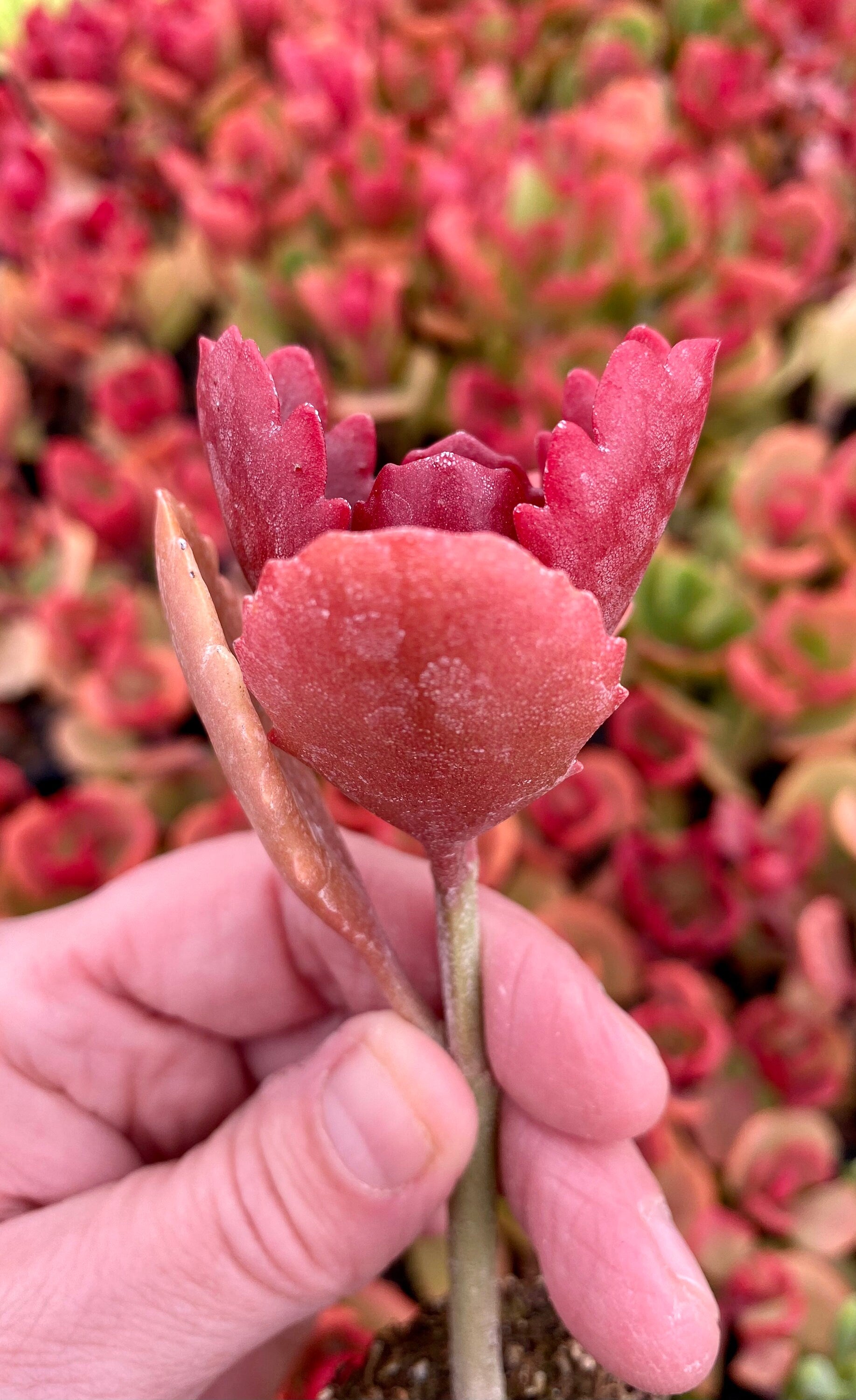 Tugela Cliff Kalenchoe is native to South Africa in the Tugela Basin! Leaves are scalloped , grow upward and are red and green ! This beautiful plug spreads and produces yellow flowers and does well in containers !