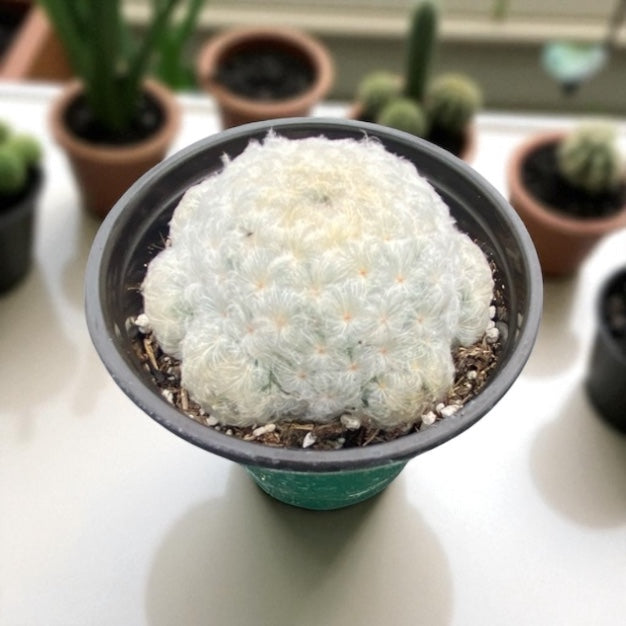 This unique and sought-after cactus is recognizable by its dense covering of soft, white, feather-like spines. This Mexican native thrives in sunny locations and can be a delightful addition to any collection!