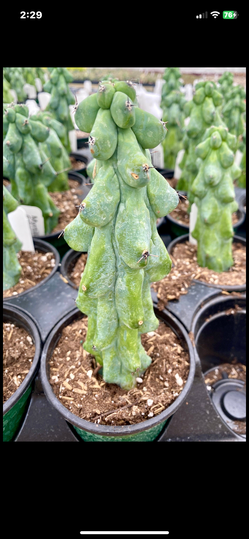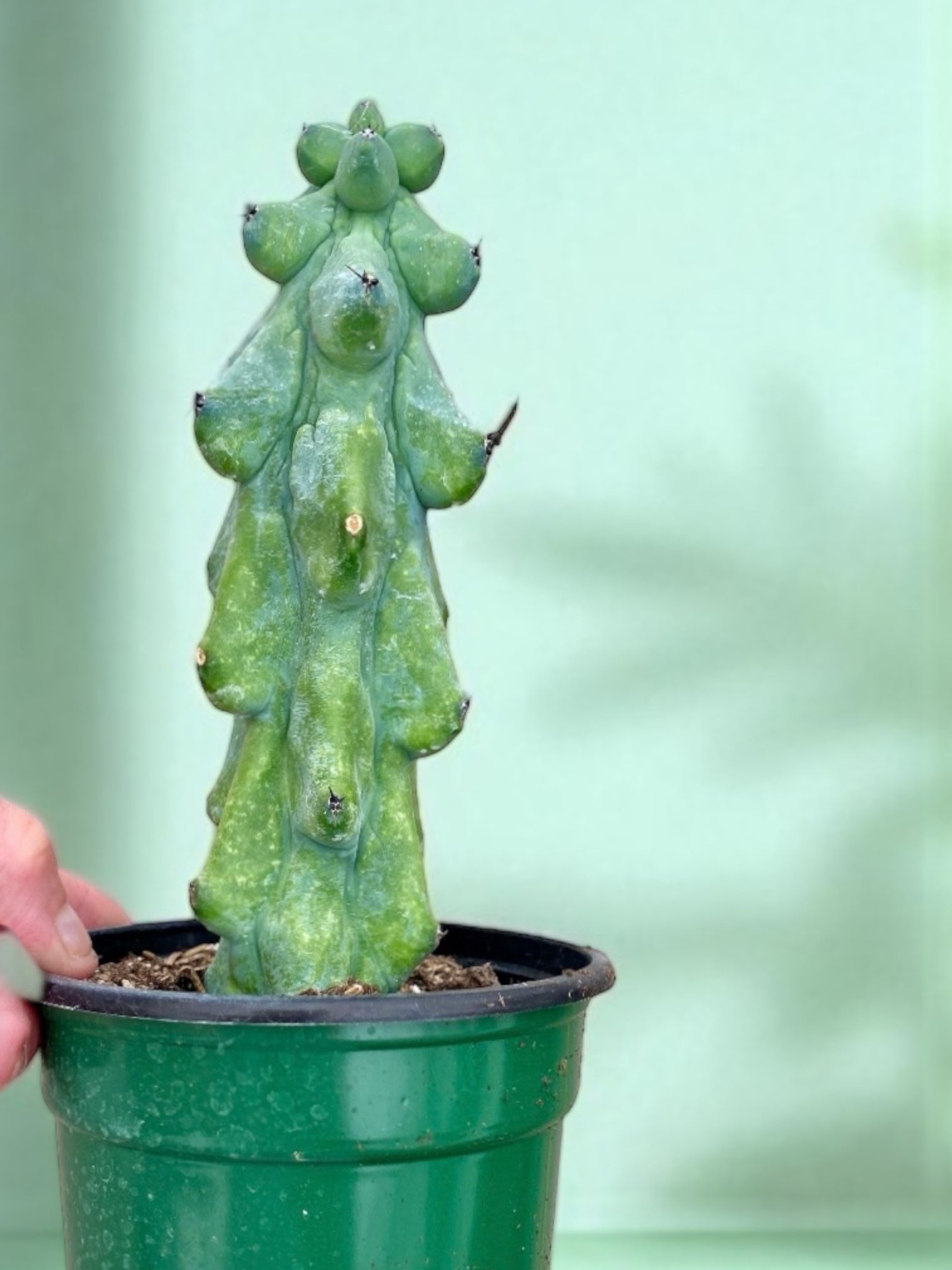 This unusual cactus is a “ Must Have “ among collectors !'Fukurokuryuzinboku', is a rare, slow-growing, and visually striking cactus variety characterized by its unique, breast-like tubercles (swellings) along its stem. It's a Japanese cultivar of the Blue Candle Cactus. The cactus is known for its blue-green, columnar stems with distinct ribs and small spines. It's a popular choice for collectors due to its unusual and somewhat humorous appearance.