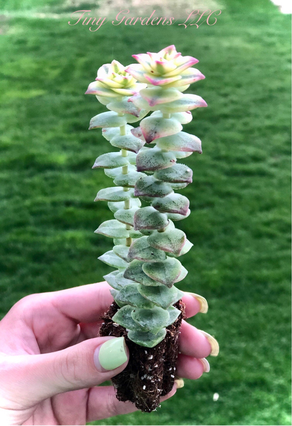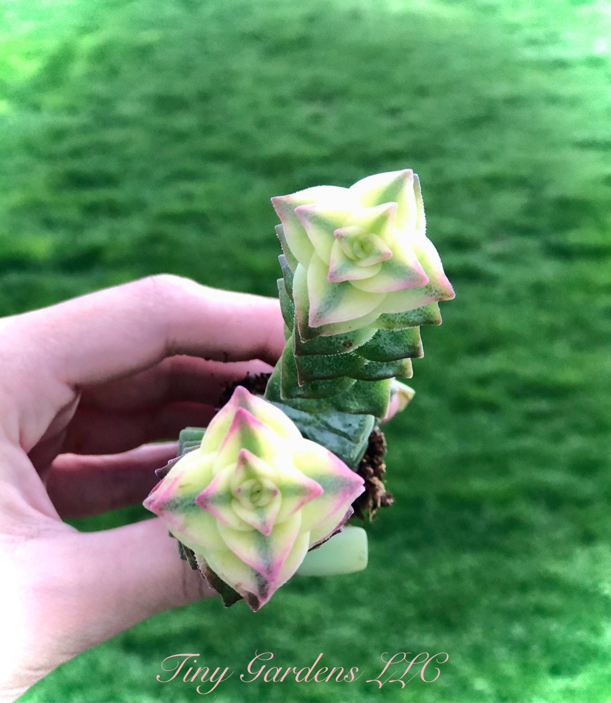 Unique Succulant with triangle leaves that are stacked on top of each other ! This Beauty is also called a " Baby Necklace" . Appx 5" tall double plug ! Colors are green with pink edges .