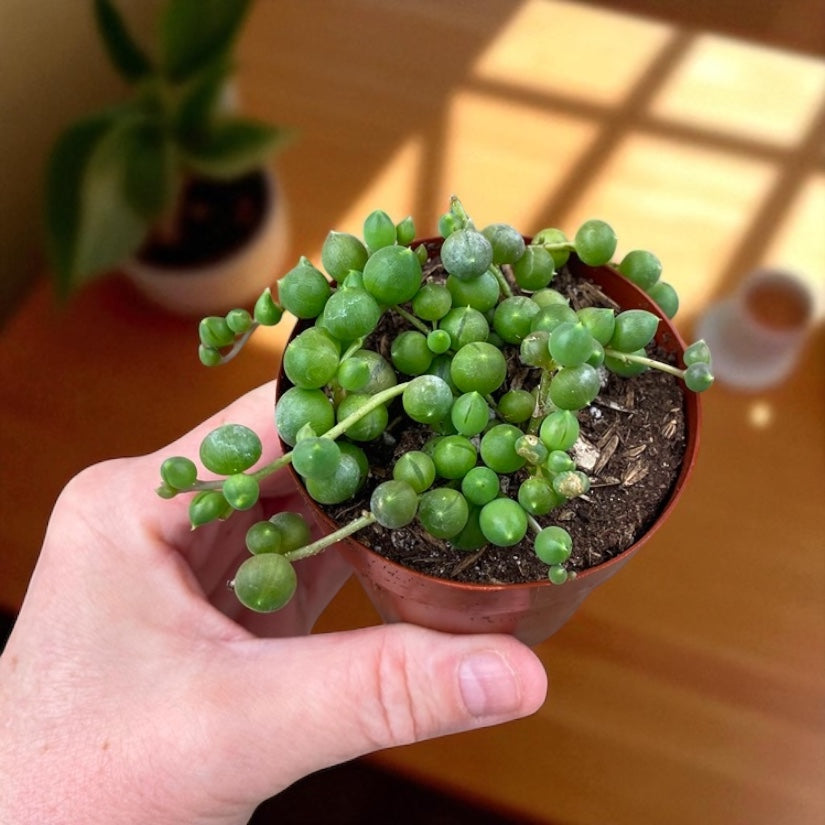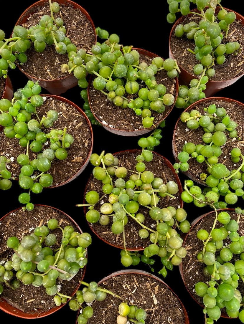 Very Plump healthy pearls ! So pretty ! Native to Southwest Africa . Great for containers or ground cover - the stems trail downward and wherever they touch , it attaches . Their flowers smell like cinnamon too! 2.5 “ pot