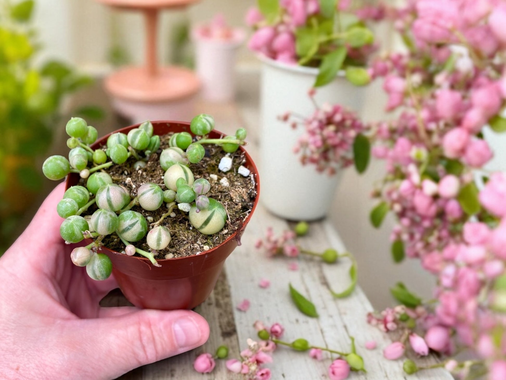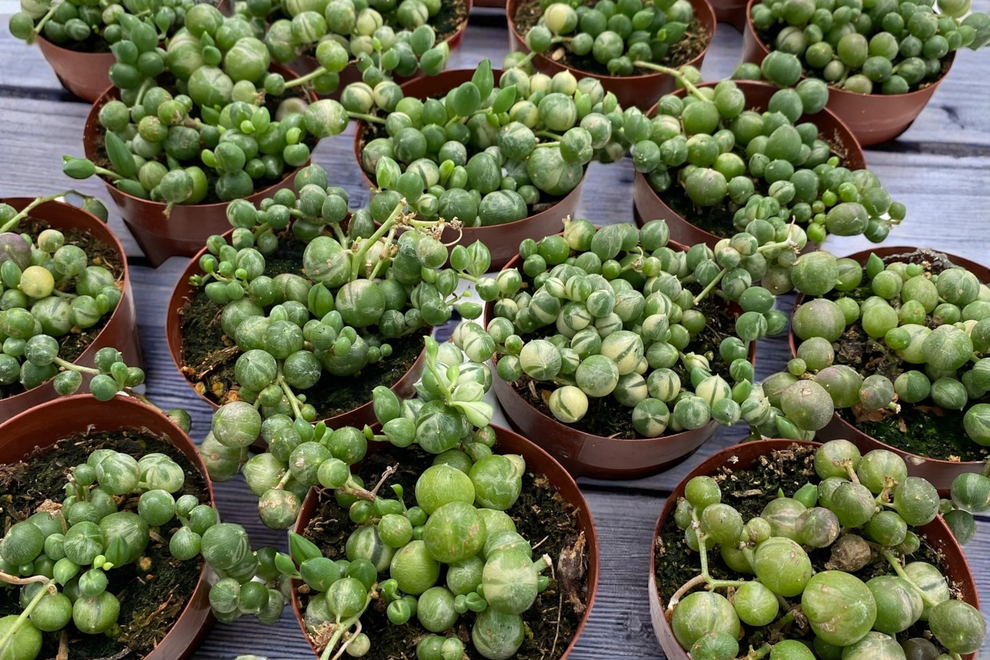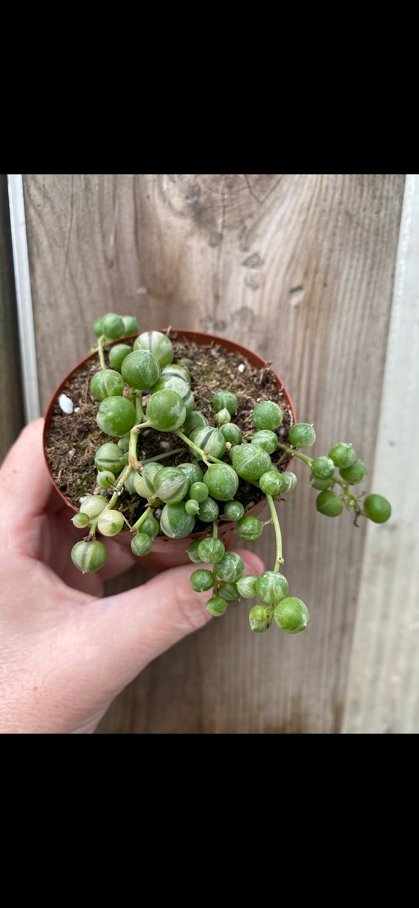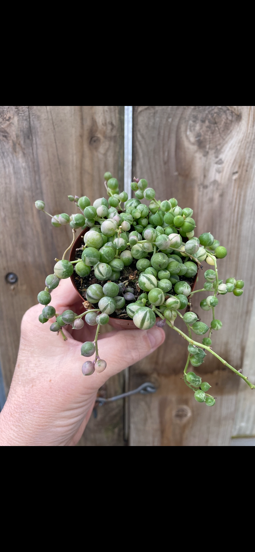 RARE!!! Green , white, cream colored ,pink Plump healthy pearls ! So pretty ! Native to Southwest Africa . Great for containers or ground cover - the stems trail downward and wherever they touch , it attaches . Their flowers smell like cinnamon too! RARE!!!